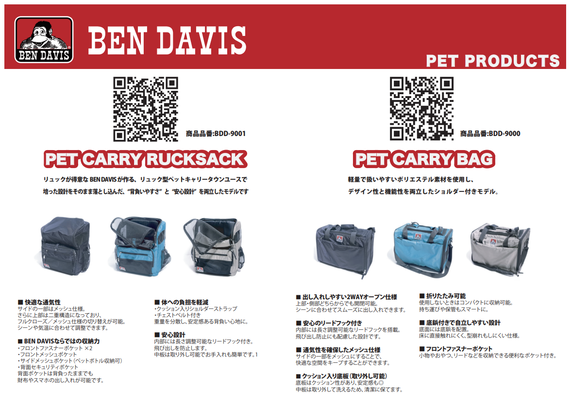 1935年創業の米ワークウェアブランド「ベンデイビス」から、待望のペット用キャリーバッグが新登場!タフな機能性を活かしたお散歩に最適なアパレルやバッグも充実。今ならイベントを記念したスペシャルプライスで、大変お買い得にご購入いただけます。愛犬・愛猫との日々を彩る新作アイテムが勢揃いのこの機会をお見逃しなく。皆様のご来店を心よりお待ちしております!